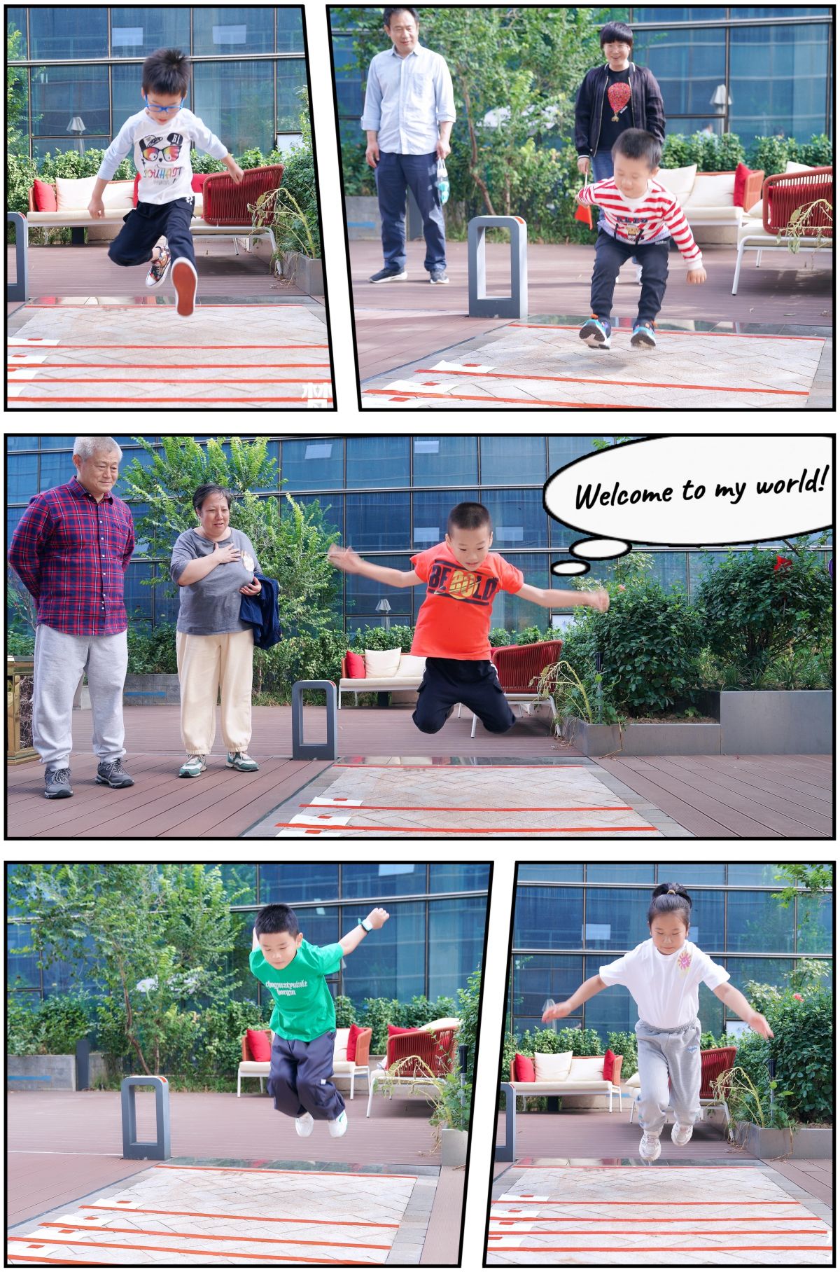 家長們看裝修,小朋友玩得也是不亦樂乎,帶著亞運精神,拼盡全力,一躍而起,盡顯少年英雄本色。