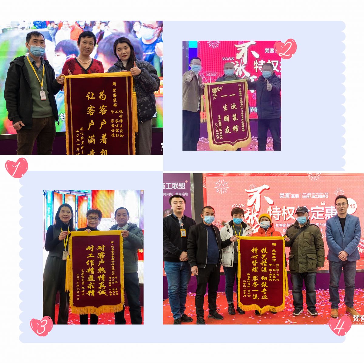 梵客的年終收官盛典可謂榮耀之夜,眾多業主送上錦旗,贊賞裝修流程非常規范化,前期對接客服很有耐心,中期對設計也滿意,工人手藝精湛,環保也做的好,讓人感到很踏實。