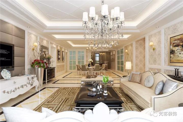 簡歐風格的空間主要以白色、淡色為主,以暖色調加以協調。家具則是白色或深色都可以,但要成系列,風格統一。客廳、餐廳、門廳過道是一個相連的空間,為了區分空間,在地面和頂面做了造型區分。
