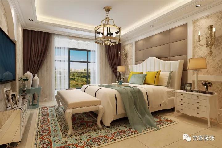 臥室鋪設地毯,但地毯和地面色差不宜太大,選擇大面積的歐式花紋地毯,主要是裝飾地面,提升舒適性。